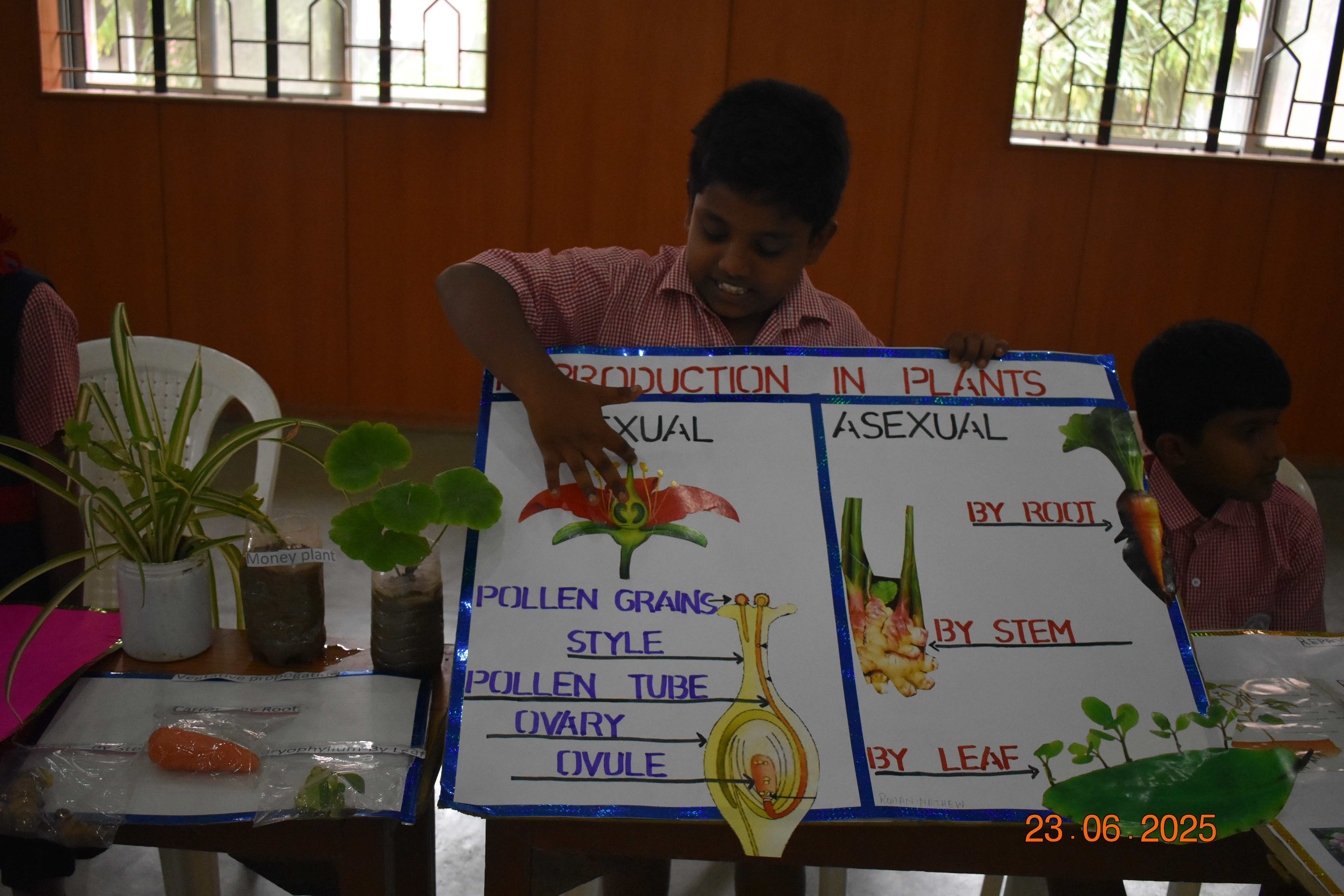 Students displayed different types of plants such as herbs, shrubs, trees, creepers and climbers. They explained how plants make their own food through photosynthesis. They showed models and charts about parts of a plant and its functions.